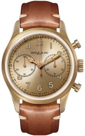 Boîtier de 42 mm = 1 5/8 ", bracelet réglable de 7" Poids du boîtier: 111 g Épaisseur du boîtier: 14,55 mm Taille de l'entrée: 22 mm Lunette fixe Boîtier en titane recouvert de bronze Boussole et gravure MontBlanc en montagne Aiguilles et index luminescents Couronne push & pull Boucle de déploiement Mouvement: Automatique