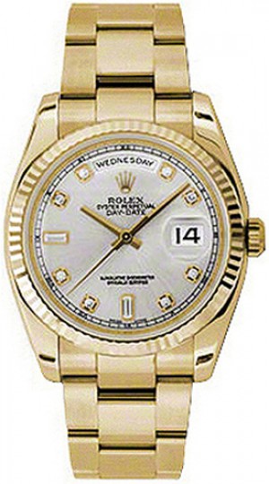 9. Rolex Day-Date 36 Montre en or cannelée avec cadran en argent et diamants 118238