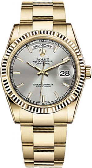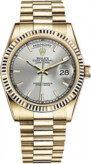 1. Rolex Day-Date 36 Montre en or massif à cadran argenté 118238