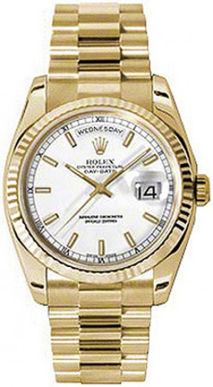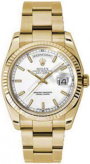 Rolex Day-Date 36 Montre en or à cadran blanc et lunette cannelée 118238
